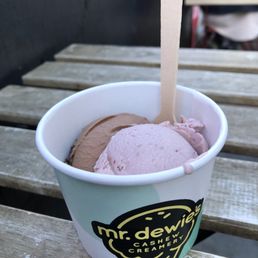 We had the screaming munchies the other night so my daughter recommended that we go to Mr. Dewey's and get ourselves some treats and bring them home and enjoy watching a movie. Cashews? Its so creamy and delish. It doesn't matter if you're lactose intolerant or you like ice cream or you want to try something new and different and healthy. This is the place. I was a little surprised because I didn't expect it to taste so much like regular ice cream. The texture was perfect. The flavors were spot on. I would not have known it was an ice cream if somebody hadn't told me that it was made from cashews and not dairy products And the flavors that they have are just right. My daughter had her favorite scoops in a cup, but my wife and I opted for the Dewey vegan dippers. You might be wondering what this is let me tell you. They usually offer a few selections of what goes in it, but it's basically an ice cream sandwich with a slight twist you select the flavor you like for the center and it's sided on both sides with wonderful vegan cookies that are soft and delicious and then they dip it in chocolate. Absolutely wonderfully delicious I recommend this is a place for young and old boy or girl, man or woman. What a perfect nighttime snack We came home and we watched our favorite movie and ate ice cream. perfect highly recommended..